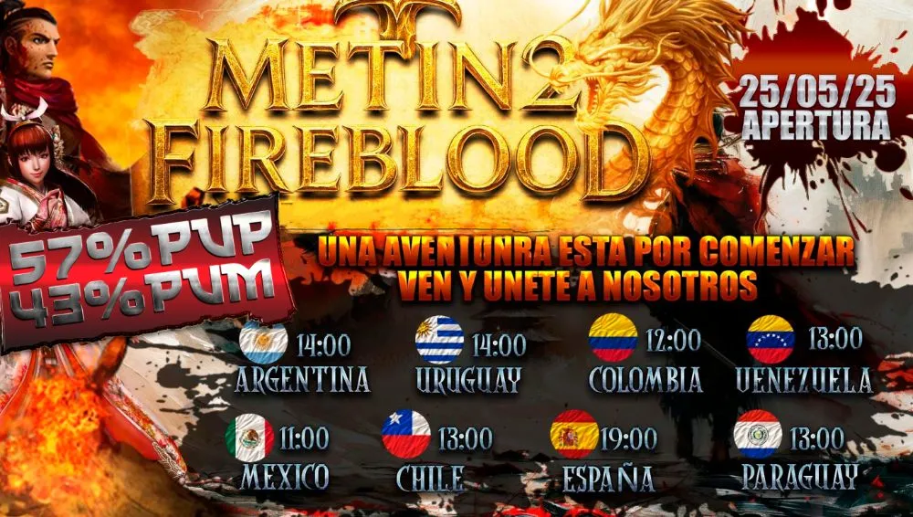 @everyone Join the group and be inspired to experience this adventure https://discord.gg/kwE4vrW2 @everyone 🎮 Metin2 FireBlooD - Opening 05/25/2025 🔥 A balanced, dynamic, and competitive server! 🧩 General Features • 🧿 Focus: 57% PvP | 43% PvM • 🧬 Starting level: 1 | Max level: 105 • 💎 +4 Stones in the shop | Maximum Upgrade +5 • 🛒 In-game Item Shop • 🚫 No Lycan • 🚫 No Alchemy 🌐 Networks & Community • 🌍 Website: https://mt2fireblood.online • 💬 Discord: https://discord.gg/4MgGttdZyt 🛠️ Exclusive Systems • 🥋 Belt System • 🎭 Hide Outfits • 🔍 View Opponent's Outfits • 🧠 Improved Auto-Doper • 📦 Special Material Storage • 🔁 Quick Channel (CH) Switching • 📊 Bonus Table • 🧾 Drop Preview (Mobs and Chests).